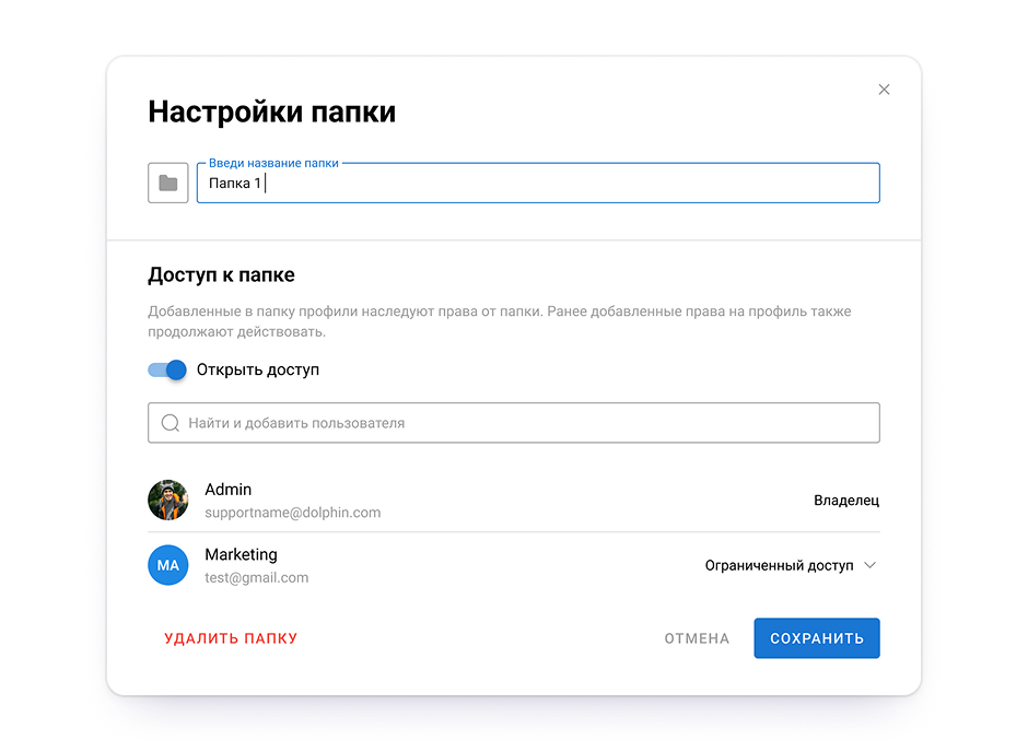Профили в папке наследуют права. Профілі в папці успадковують права. Это позволяет быстро и гибко настраивать систему прав внутри команды
